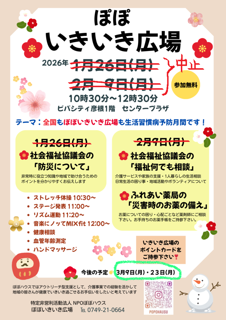 2月9日(月)の ぽぽいきいき広場 は、雪のため、残念ながら中止させていただきます。