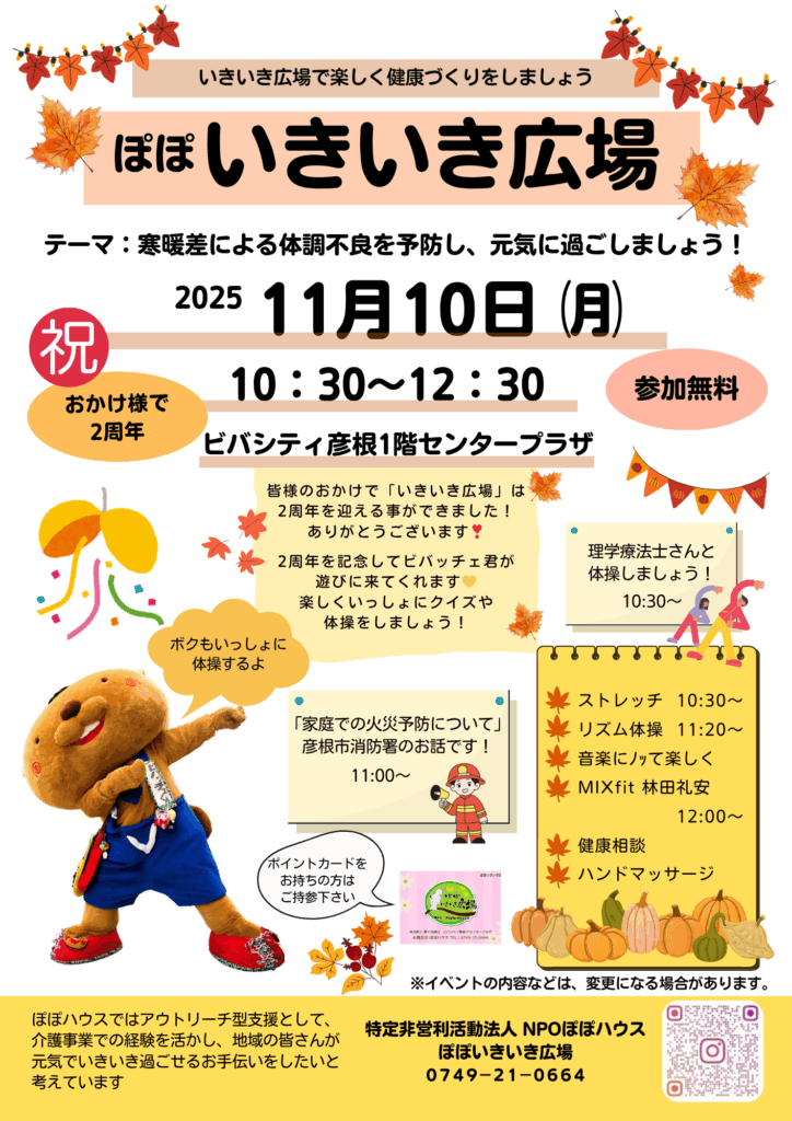 今回は、ぽぽいきいき広場2周年記念でビバッチェくんも参加です❣ 彦根市社会福祉協議会の”福祉なんでも相談”コーナーや 彦根市消防署より”家庭の火災予防”のお話も聞けます♪